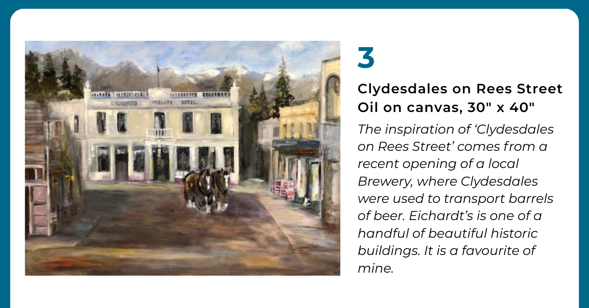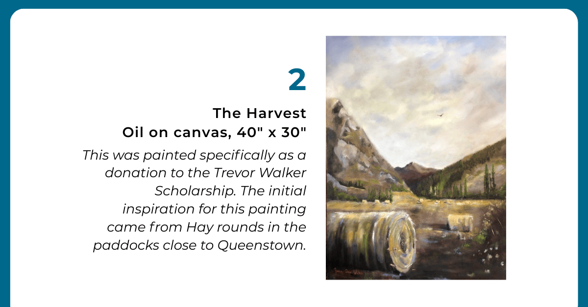 A self-taught artist, I use oil paint, incorporating techniques of the ‘Traditional Old Masters’. The biggest advantage of living in Queenstown is that I am surrounded by reference material. My paintings resonate with the beauty of the four seasons, better seen in a rural environment, as well as the ‘number 8 wire’ approach that reflects the resourcefulness of New Zealand Rural GP’s. For me, the Trevor Walker Scholarship will benefit all people in need of help.
